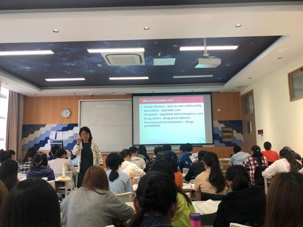 在分享会中,卫生管理教研室的黄萍老师首先介绍自己在美国杜兰大学访学时的就医经历,为后面《浅谈美国卫生保健系统》的分享内容做了铺垫。她围绕美国卫生保健系统的三个主体、美国卫生保健系统以及中国上海卫生保健系统三部分内容开展介绍和讨论。黄老师以幽默、风趣的语言和个人切身实际阐述中美两国卫生保健系统差异,得到了同学们的积极回应。