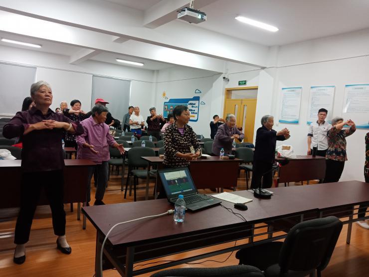 活动的另一内容是“八段锦”的现场教学,一些学习过八段锦的老年人积极性很高,和同学们一起向其他不太了解八段锦的老人们宣传练习八段锦对身体的益处,并一同示范;而一些没有学过八段锦的老人们在大家的带领和指导下很快就融入锻炼。