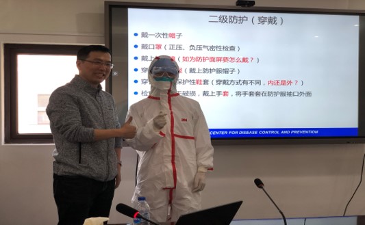 在上海市疾病预防控制中心,中心合作交流培训处陈依副处长和单婵娟老师带领同学们现场观看了上海市疾病预防控制中心宣传介绍片,刘方珉老师和何永超老师结合实践为同学们介绍上海市疾控体系和公共卫生应急体系的架构和主要内容,曾参加武汉抗疫的江宁老师声情并茂地跟同学们分享亲临武汉抗击疫情的现场经验,讲到现场细节几度哽咽。同时,中心老师为同学们讲解作为公共卫生人员的个人卫生防护方法,并请员工志愿者现场演示和体验专业防护服的穿脱方法,加深同学们对公共卫生工作的认识,体会身为一名公卫人的使命感和责任感。