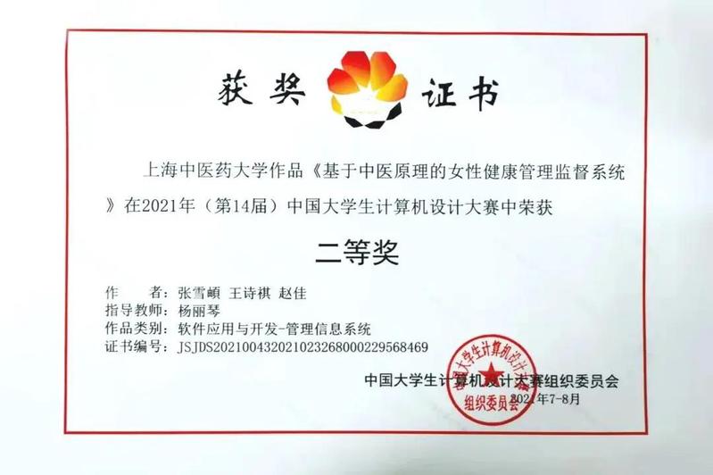 近日,在2021年(第14届)中国老员工计算机设计大赛软件应用与开发类比赛中,公司一组作品经过上海市老员工计算机设计大赛推选,与全国上百所高校参赛作品进行角逐,最终荣获全国二等奖。获奖的作品是由公司图书馆计算机综合教研室教师杨丽琴指导,公司2019级公共事业管理(卫生管理方向)班张雪頔、王诗祺、赵佳完成的管理信息系统作品《基于中医原理的女性健康管理监督系统》。这也是公司员工参赛以来获得的最好成绩之一。