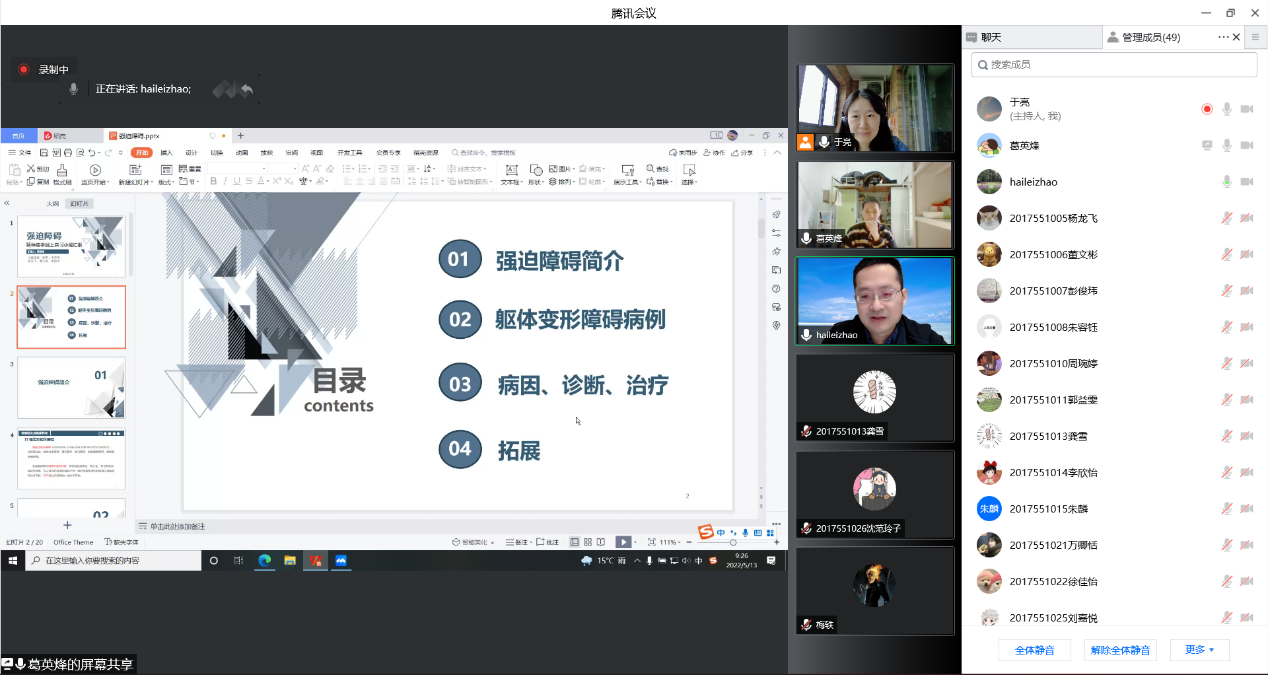 5月13日,太阳成集团tyc234cc精神病学线上实习汇报交流会顺利举办,预防医学专业员工分组开展汇报,围绕8个精神病典型案例,结合病案分析和文献研究,从不同侧重点对临床精神科疾病开展深入研究。实习汇报获评审专家肯定,展现公司预防医学专业员工严谨的学风和扎实的专业能力。太阳成集团tyc234cc经理赵海磊、预防医学教研室金如锋、全科医学系于亮以及2017级、2018级预防医学专业51员工参加汇报交流会。