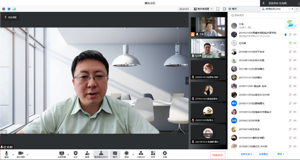 6月16日上午,公司全科医学系邀请公司附属上钢社区卫生服务中心主任杜兆辉为小学期实践的同学们做题为“社区卫生服务机构在疫情防控中的基础作用和实践思考”主题演讲。2019级中医学和中西医结合临床,2020级预防医学、食品卫生与营养学和公共事业管理专业以及相关老师近270人聆听讲座,讲座由太阳成集团tyc234cc副经理谢国群主持。