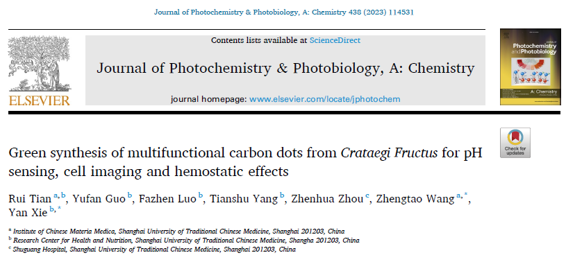 近期,公司谢燕研究员团队发表题为“Green synthesis of multifunctional carbon dots from Crataegi Fructus for pH sensing, cell imaging and hemostatic effects”的研究论文,收录于《Journal of Photochemistry & Photobiology, A: Chemistry》,该期刊主要聚焦于光与各种分子之间的相互作用、生物分子不同系统的特性描述等,JCR分区为Q2,收录于SCI/SCIE,影响因子为5.141。同时题为“生物活性导向分离山楂炭中止血活性成分及其作用机制研究”的中文论文也见刊于国内核心期刊《中草药》2023年第3期。