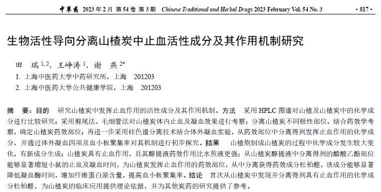 该研究从化学成分及碳点两方面对山楂炭止血作用物质基础及其作用机制进行探究。通过对山楂炭不同提取成分的分离获得有效成分松柏醛,该成分能够显著降低凝血酶时间,增加纤维蛋白原含量,提高血小板聚集率,起到止血的作用。进一步分离纯化得到的多功能山楂炭碳点(CFCDs),粒径为2.35 ± 0.67 nm,为石墨晶型,表面存在丰富的羟基、羧基等官能团,具有较高的水溶性和良好的稳定性。本研究首次发现并分离、制备了山楂炒炭过程中产生的具有止血作用的化学成分松柏醛;发现并制备、表征了山楂炭中具有止血作用的山楂炭碳点,初步明确了山楂炭中发挥止血作用的物质基础及山楂炒炭止血的机制,为山楂炭的临床应用提供理论依据,并为其它炭药的研究以及从天然材料中发现多功能碳点提供了有益参考。