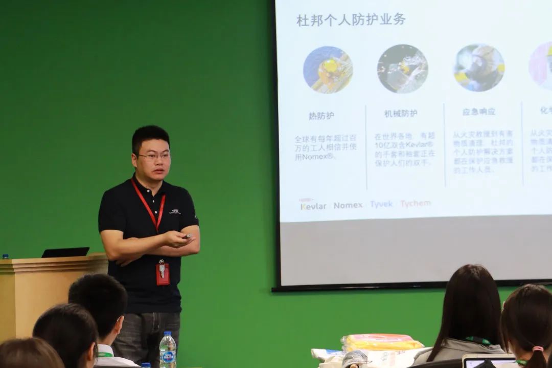 无论在哪个领域,风险岗位都可能面对燃爆/极端温度伤害、机械伤害、化学伤害等重重危险。针对不同性质的风险,来自杜邦的技术支持专家徐晔先生为同学们介绍了个人防护装备的分类、功能和使用等,帮助大家了解这些装备在不同危险环境下如何提供保护。