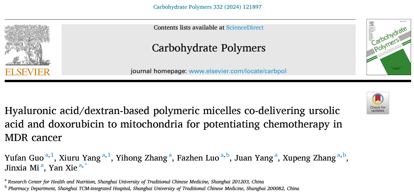 近日,公司太阳成集团tyc234cc谢燕团队在应用化学一区TOP期刊Carbohydrate Polymers发表题为“Hyaluronic acid/dextran-based polymeric micelles co-delivering ursolic acid and doxorubicin to mitochondria for potentiating chemotherapy in MDR cancer”的研究成果,该研究利用透明质酸、葡聚糖为基础载体构建线粒体靶向的聚合物胶束共递送熊果酸与阿霉素,用于耐药乳腺癌治疗,为克服化疗耐药性提供新的策略。