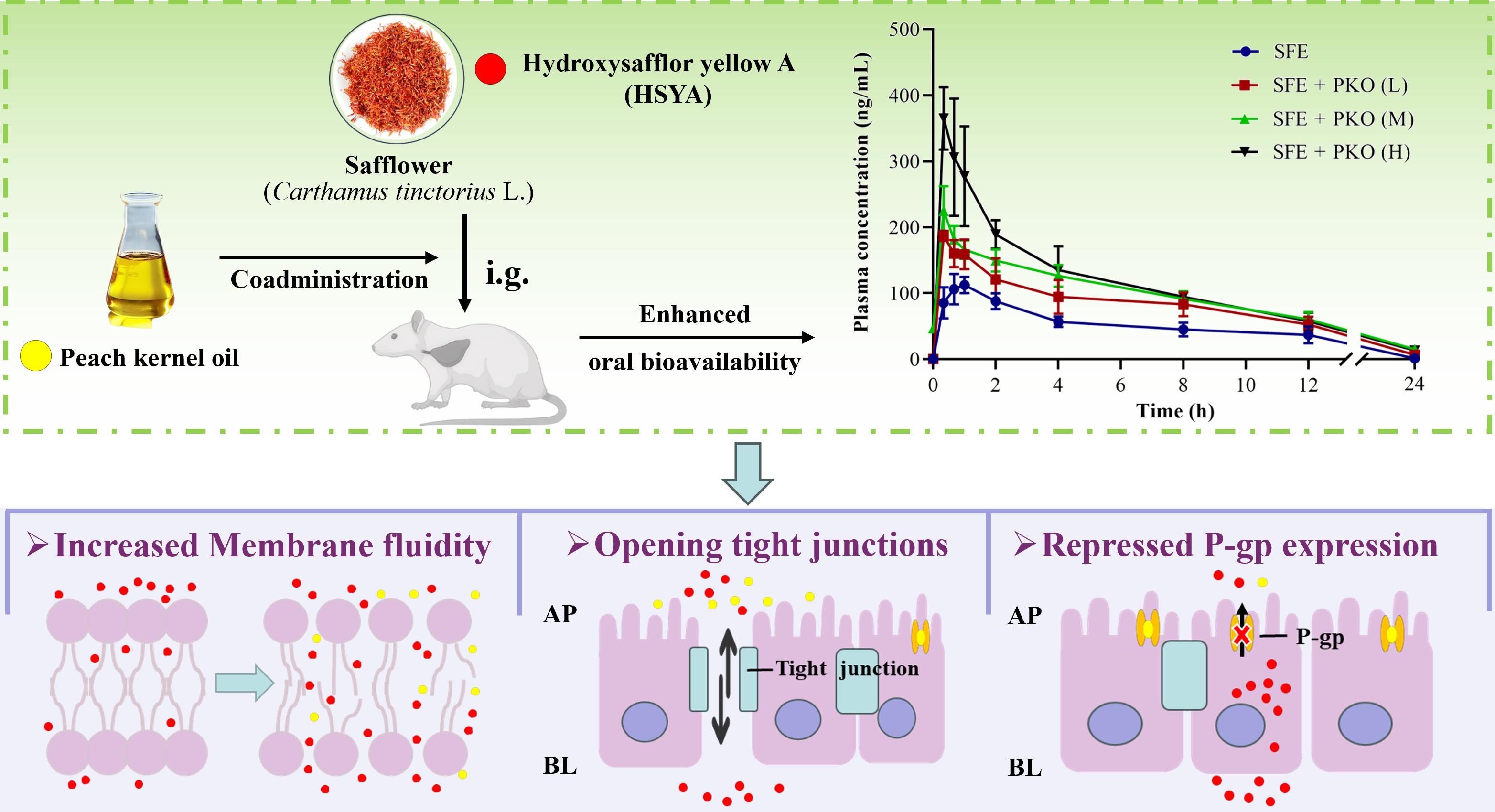 近日,公司健康营养研究室谢燕团体在食品化学一区TOP期刊Food Chemistry发表题为Absorption enhancement of peach kernel oil on hydroxysafflor yellow A in safflower extracts and its mechanisms的研究成果,该研究揭示了桃仁油对红花中羟基红花黄色素A的口服吸收增强作用及其潜在机制。这一发现为从中药复方配伍角度探究植物化合物的口服生物利用度提升策略提供了新的思路,有望应用于医药和食品领域。